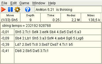 The larger text area at the bottom shows the current primary variation(s), i.e. the best variation the engine has examined so far.