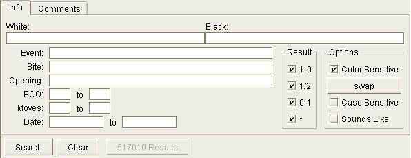 For example, if you want to search for all games that Kasparov has won with white or with black, enter "Kasparov", check "1-0" and do not check Color Sensitive .