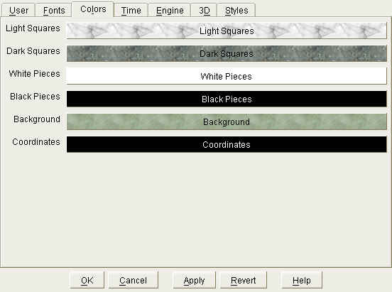 Choose colors or textures for the board display. Click on one of the buttons to open a Color Chooser .