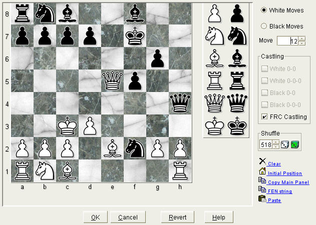 To set up a FRC position, enter a number from 1 to 960 and press the return key. Or press the "dice" button to choose a position by random.